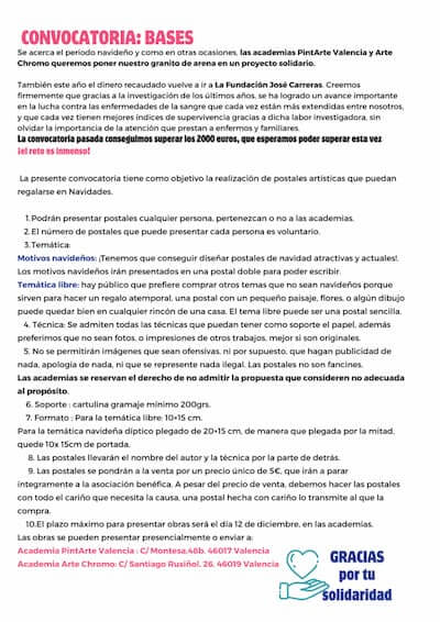 Si quieres presentar tus postales debes saber que, también este año el dinero recaudado vuelve a ir a La Fundación José Carreras. PintArte Valencia y Arte Chromo creen firmemente en la investigación de los últimos años. Gracias a ella se ha logrado un avance importante en la lucha contra las enfermedades de la sangre que cada vez están más extendidas entre nosotros. Estas enfermedades tienen cada vez mejores índices de supervivencia gracias a la labor investigadora, sin olvidar la importancia de la atención que prestan a enfermos y familiares. La convocatoria pasada consiguieron 2050 euros, que esperan poder superar esta vez ¡El reto es inmenso!