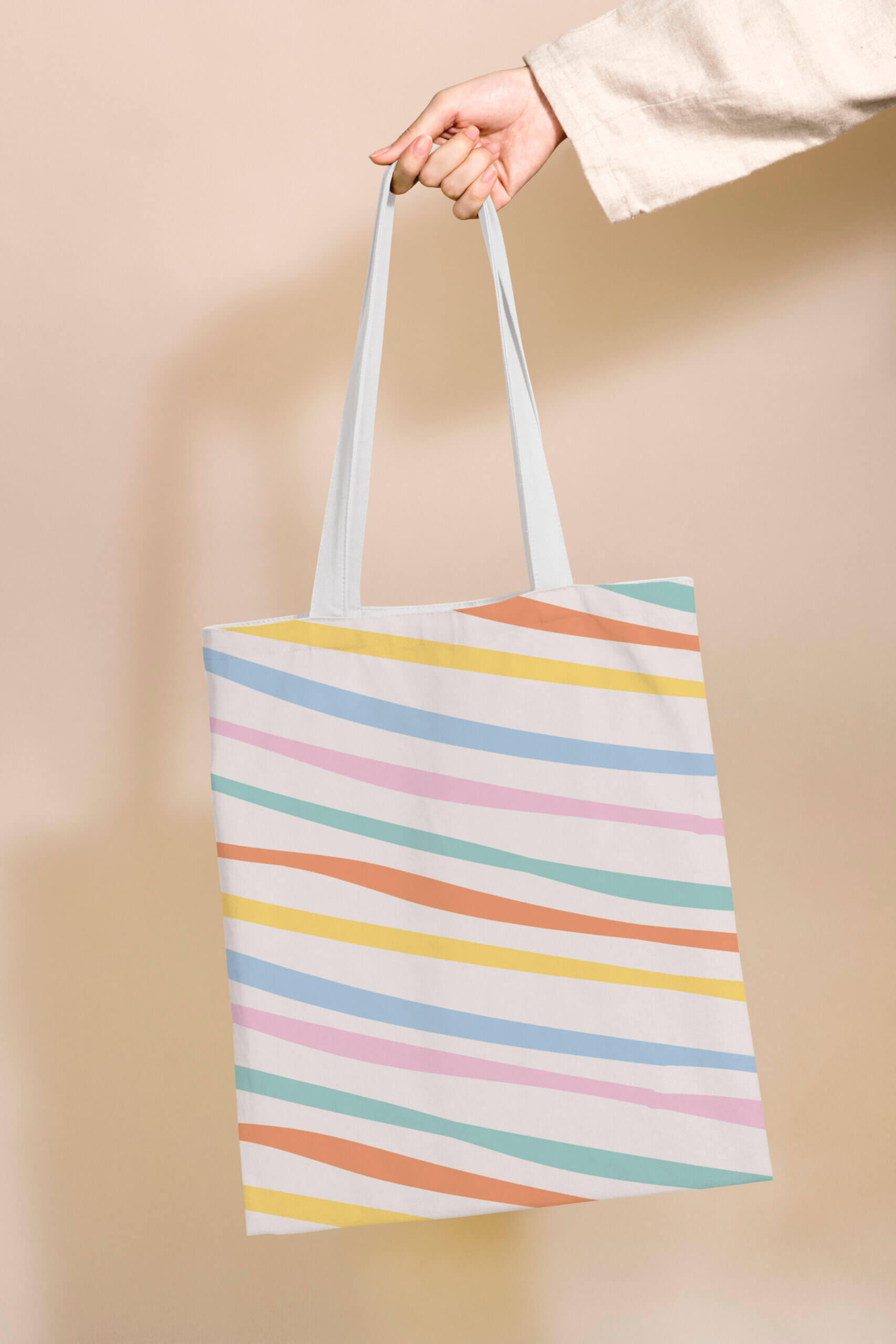 Tote bag mockup psd with pastel stripes pattern
